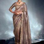 This is a luxurious and elegant smoky mauve saree with exquisite gold detailing.